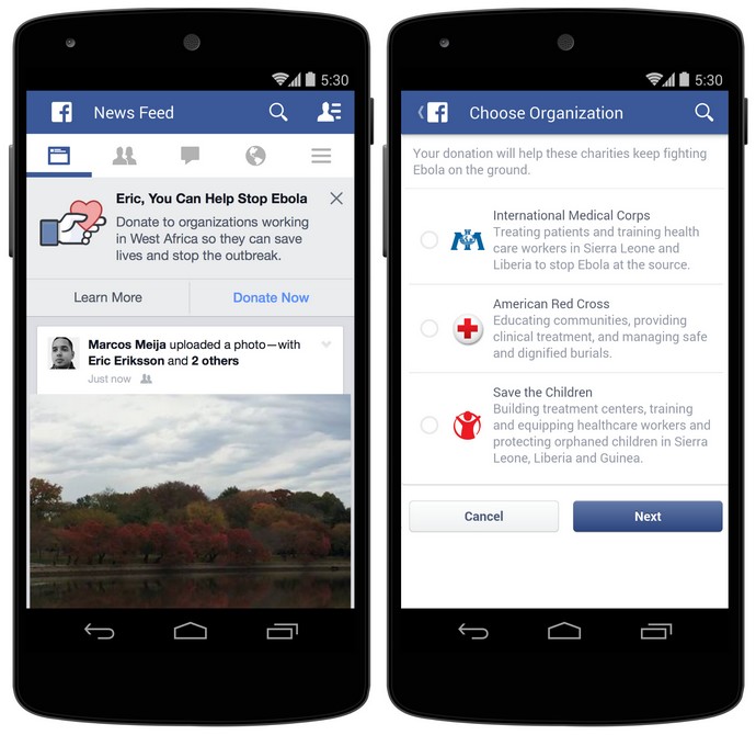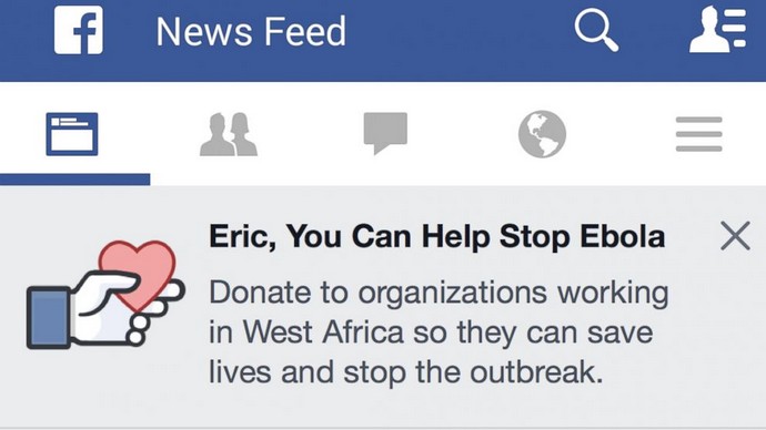 Foi anunciada uma campanha na última quinta-feira, dia 06, pela rede social Facebook que informou a todos as pessoas conectadas que agora é possível fazer doações para as diversas instituições que estão combatendo o vírus Ebola. Apenas apertando um botão presente no topo da página do feed de notícias você poderá fazer parte dos doadores e mudar a vida de muitas pessoas que estão sofrendo com a doença.