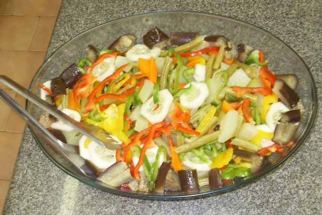 Modo de preparar: lave muito bem o alimento. Depois corte a berinjela em tiras finas e leve ao forno. Quando estiver cozida, retire-a e deixe esfriar. Corte rodelas de cebola, pimentão vermelho, tomate e alho. Misture tudo e tempere a gosto. Bom apetite!
