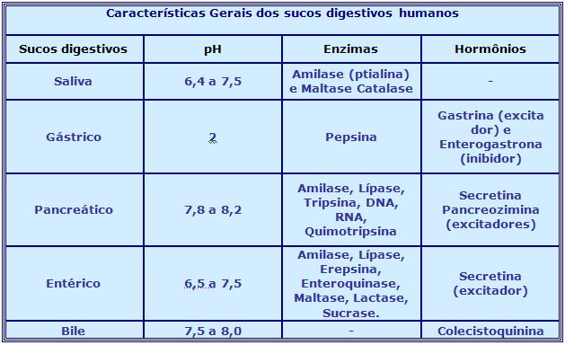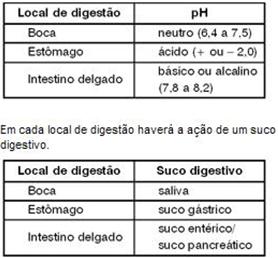A digestão depende de fatores químicos importantes como, por exemplo, o pH. Existem três locais do sistema digestório que ocorrem os processos de digestão, e em cada um deles o pH é diferente.