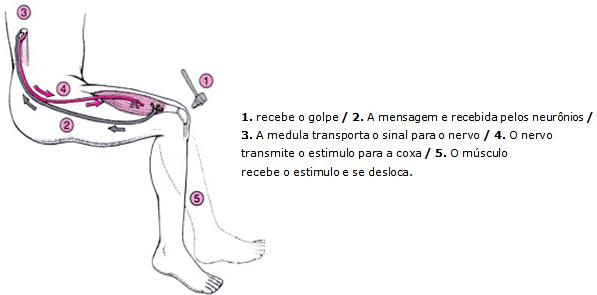 Recebe o golpe / provoca os neurônios / os axônios invadem a medula dorsal e provocam a sinapse / os neurônios motores recebem a mensagem do estimulo / os axônios presentes nos neurônios motores estimulam a coxa / dando-se o ato de movimentação do músculo / estes estímulos são transportados para o encéfalo / recebendo a mensagem do golpe sofrido.