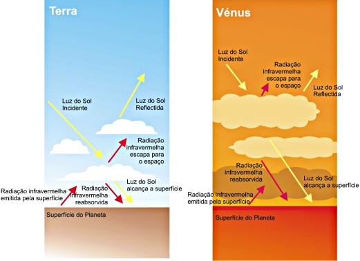 A temperatura é mais elevada que a de Mercúrio, apesar de Vênus estar mais afastado do Sol. O que causa isso é o efeito estufa de Vênus. A explicação desse efeito é a opacidade de sua atmosfera para radiações infravermelho, provocada pela grande concentração de CO2 Ocorre que a radiação visível penetra na atmosfera e aquece a superfície. A superfície aquecida emite infravermelho. O CO2 absorve essa radiação causando o efeito estufa. Esse efeito é mais ou menos como um carro fechado, recebendo as radiações solares. Essas radiações penetram no interior do veículo e o calor não sai, e quando se entra no veículo sente-se o mormaço devido ao acúmulo de calor.