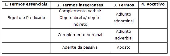 A oração pode ser subdividida em alguns termos, classificados em três diferentes tipos.
