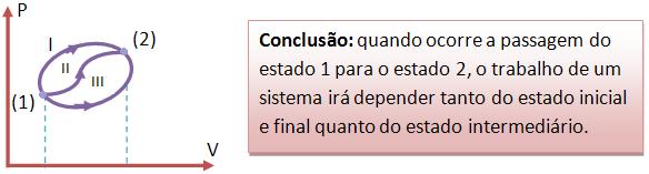 Observando outro diagrama, podemos ver que quando o sistema passa de (1) para (2), ele realiza trabalhos, porém um diferente do outro, quando percorrem caminhos diferentes.