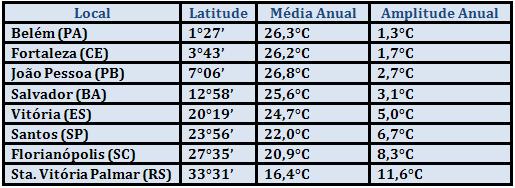 Em relação às médias térmicas anuais, o Nordeste apresenta os índices mais altos com 28°C. Nas proximidades do Equador a média térmica anual é sempre maior que 25°C e amplitudes térmicas anuais menores que 5°C. Conforme vamos nos aproximando do Trópico de Capricórnio as médias térmicas vão se reduzindo, e em conseqüência disso as amplitudes térmicas anuais aumentam em razão da maior força do inverno. As áreas de menores médias térmicas anuais do Brasil são encontradas na região Sul, com menos de 20°C.