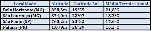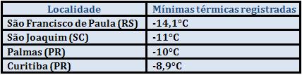 No Brasil as máximas térmicas variam entre 40°C e 44°C, e as mínimas dificilmente descem a menos de -10°C. Veja no quadro abaixo as mínimas térmicas já registradas: