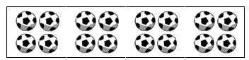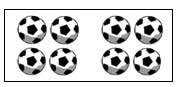 | • Edu desenhou 2 grupos de 4 bolas: 2 vezes 4 bolas são bolas [R] 2 x 4 = [R] |