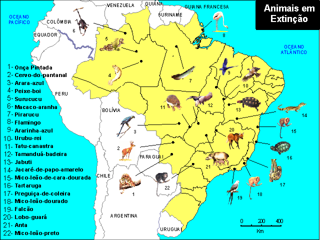 Atualmente, pesquisas revelam que cerca de 627 espécies brasileiras estão ameaçadas de extinção pelos fatores que já mencionamos. Essas espécies são o Peixe-Boi, a Jaguatirica, a Tartaruga-oliva, o Tamanduá-bandeira, o Cervo- do- pantanal, o Lobo-guará, a Onça-pintada, o Mico-leão-dourado, a Onça-parda, a Tartaruga-de-pente, e a Ararinha azul.