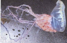 A caravela, se desloca na superfície da água de mares tropicais, através da ação do vento sobre sua bóia azul repleta de gases. Seus tentáculos urticantes, que podem ter mais de 20 metros de comprimento, estão presos aos pólipos da parte inferior da bóia.