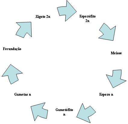 Na reprodução sexuada, são formados os gametas que se reproduzem gerando um zigoto. Este zigoto divide-se pela mitose formando um esporófito, que por sua vez, é reproduzido assexuadamente, dando origem aos esporos.