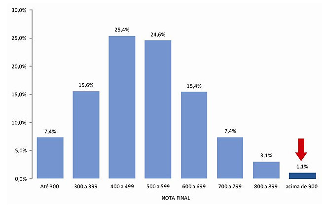 De qualquer modo, ficou bem mais complicado tirar uma nota muito alta. Apenas a título de curiosidade, no ano passado – 2012 – de todos os 4 milhões e 100 mil inscritos na prova, apenas 1,1% chegou a atingir – ou superar – o patamar dos 900 pontos, de nota final – sempre destacando que o máximo são 1000 pontos.