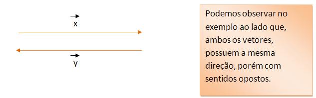 Vetores opostos Por Redação01/06/2012 às 10:49 Vetores opostos Conseguimos identificar dois vetores opostos, quando eles possuem o mesmo módulo e a mesma direção, porém, sentidos opostos.